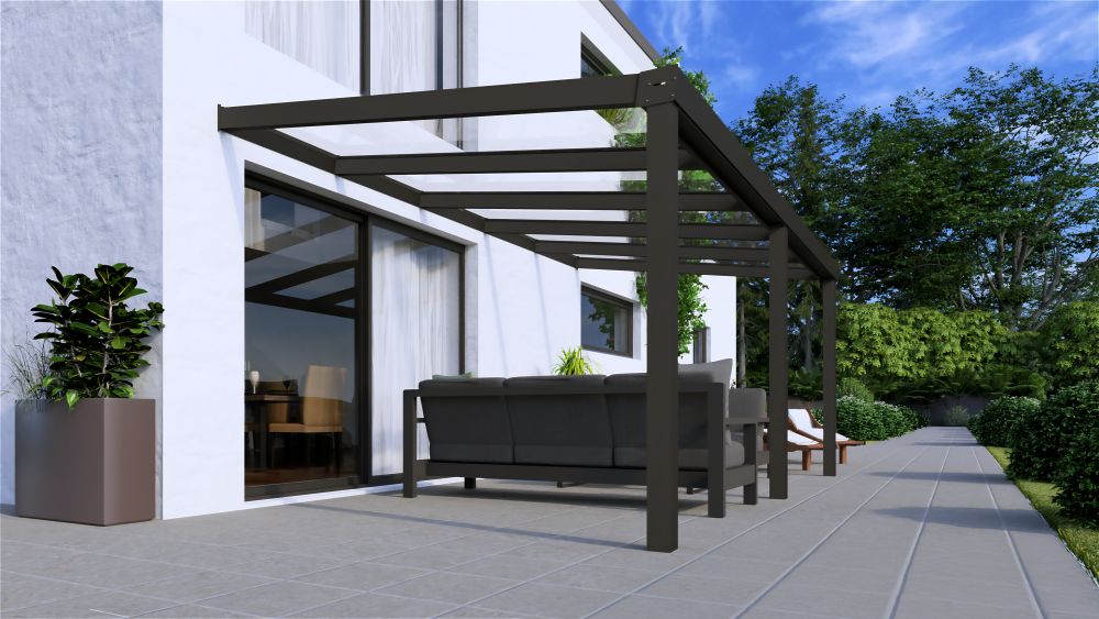 Moderne Terrassenüberdachung aus Aluminium in anthrazit mit Glas Dacheindeckung. Bestellen Sie Ihr neues Terrassendach online und montieren Sie selbst.