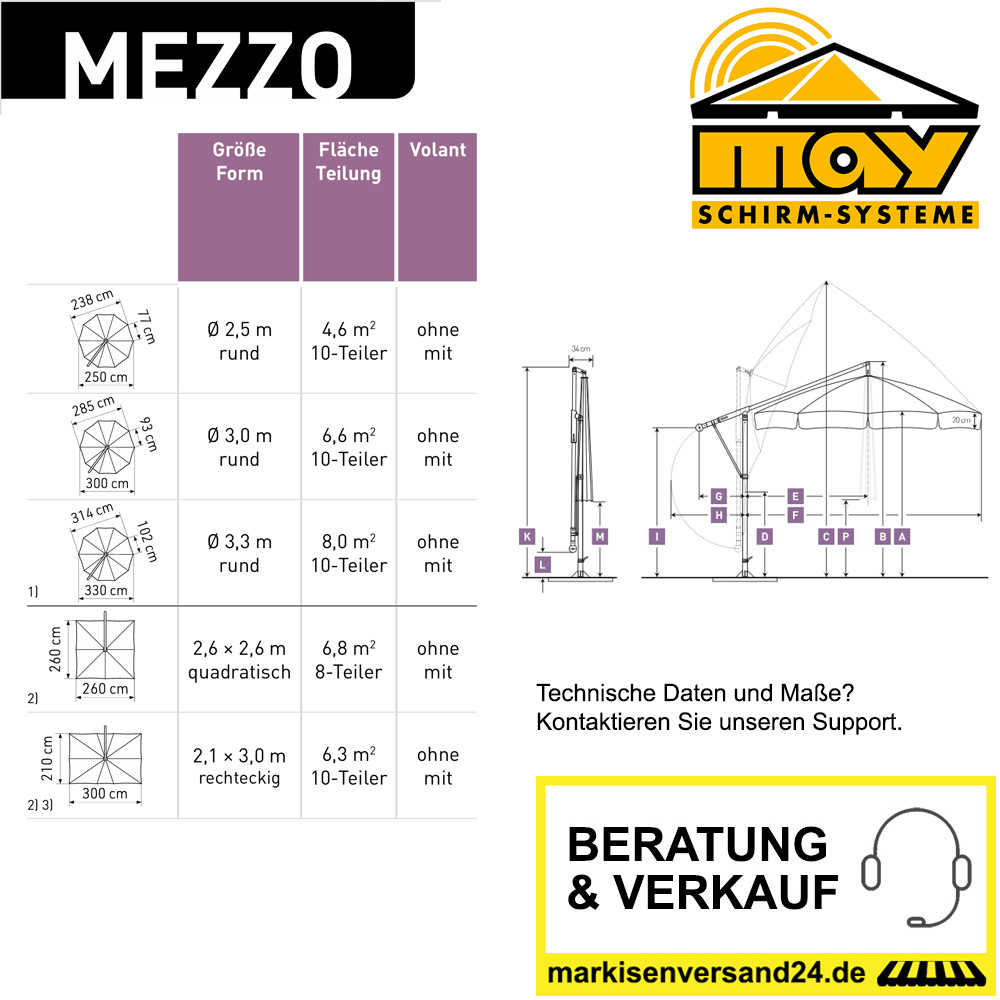 In welchen Maßen ist der May Sonnenschirm Mezzo erhältlich?