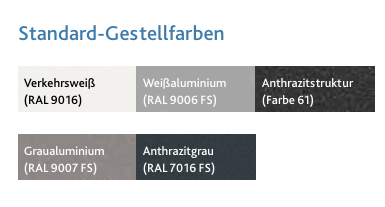 Die Standard-Gestellfarben sind Verkehrsweiß RAL 9016, Weißaluminium RAL 9006, sowie Anthrazitstruktur Farbe 61.