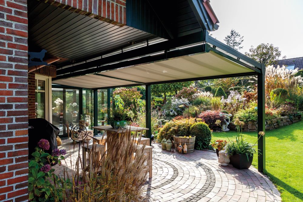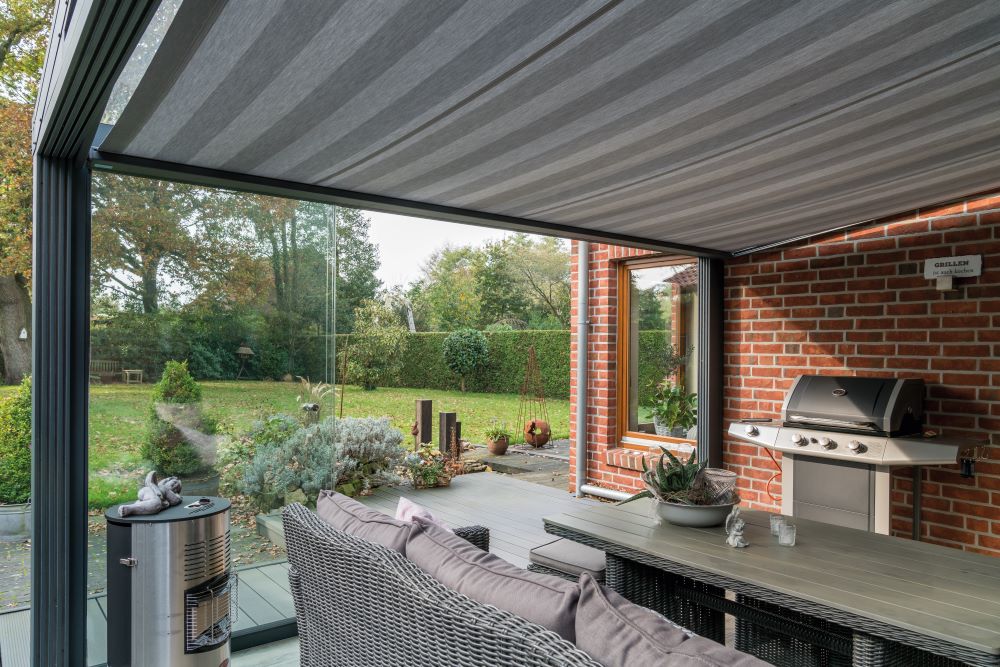 Ein effektiver Sonnenschutz ist auch bei offenen Glasüberdachungen unverzichtbar. Die Trend 200 bietet dabei eine stilvolle Lösung: Durch die Montage „von unten“ verleiht sie Ihrer überdachten Terrasse einen angenehmen, textilen Charakter.
