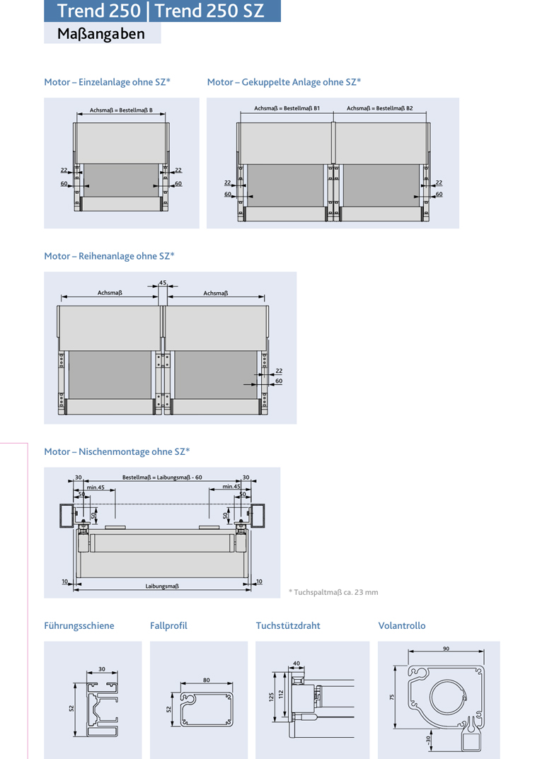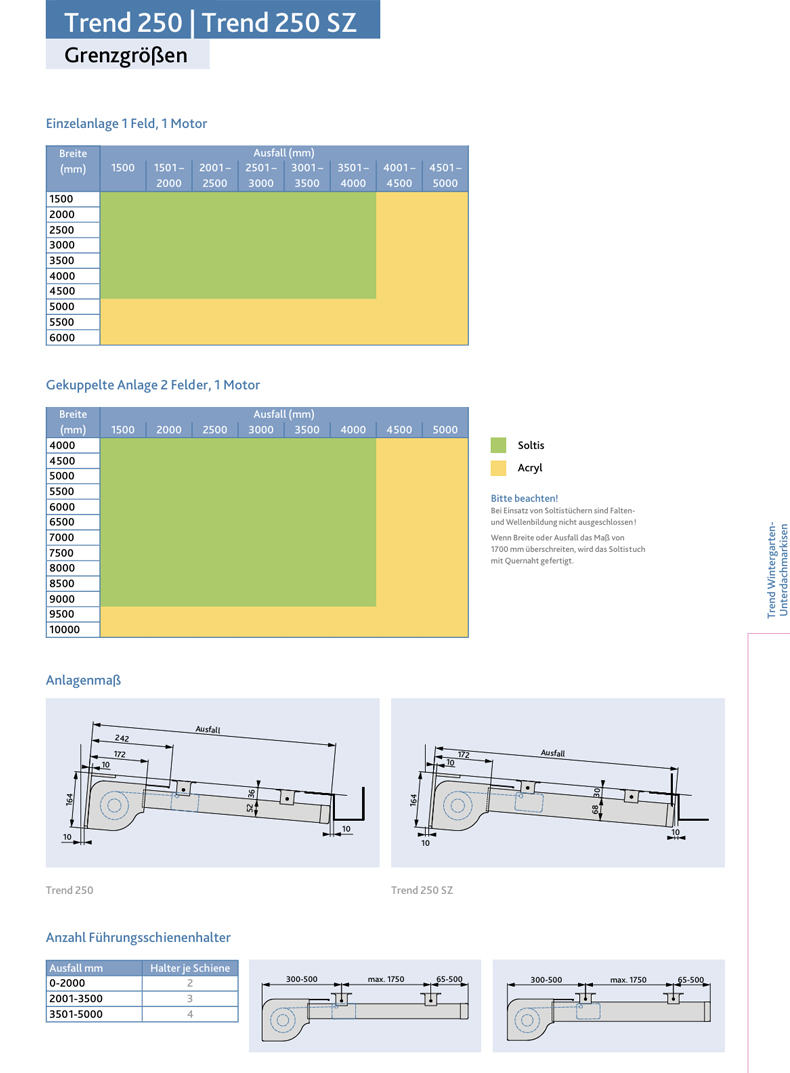 - bei Anlagenbreite oder Ausfall über 400cm kann es zu einem verstärkten Tuchdurchhang kommen. Durch zusätzlichen Tuchstützdraht kann dem entgegengewirkt werden. (Achtung: Bei Einsatz mit Volantrollo ist kein Tuchstützddraht möglich