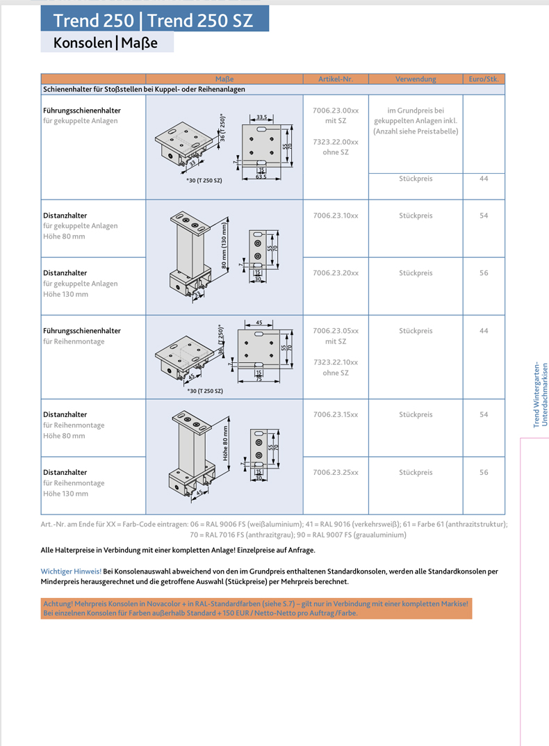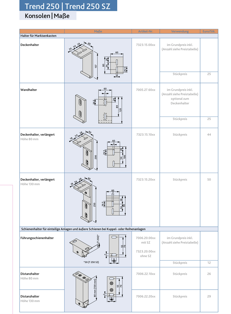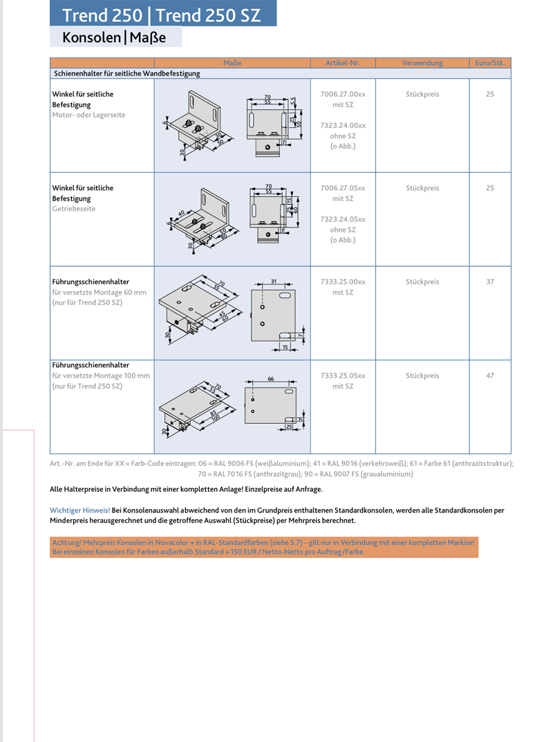 - Schienenhalter (Standard oder für seitliche Befestigung)