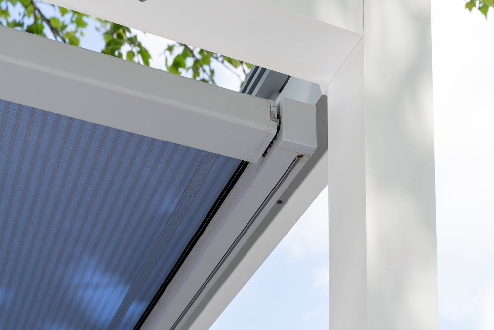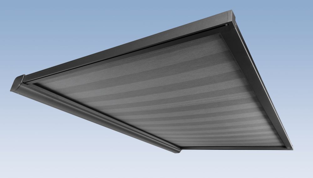 - Seitensaumgeführte Ausführung: Der Markisenstoff wird seitlich in Führungsschienen geführt, wodurch keine Lichtspalte zwischen Tuch und Schienen entstehen.
