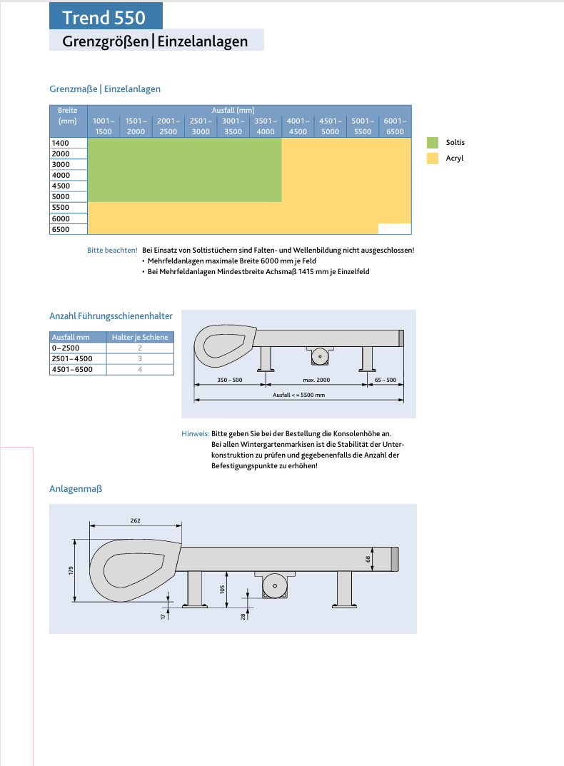 - Trend 550 bis max. 600cm Breite und 650cm Ausfall, bzw. 650cm Breite und 600cm Ausfall erhältlich